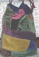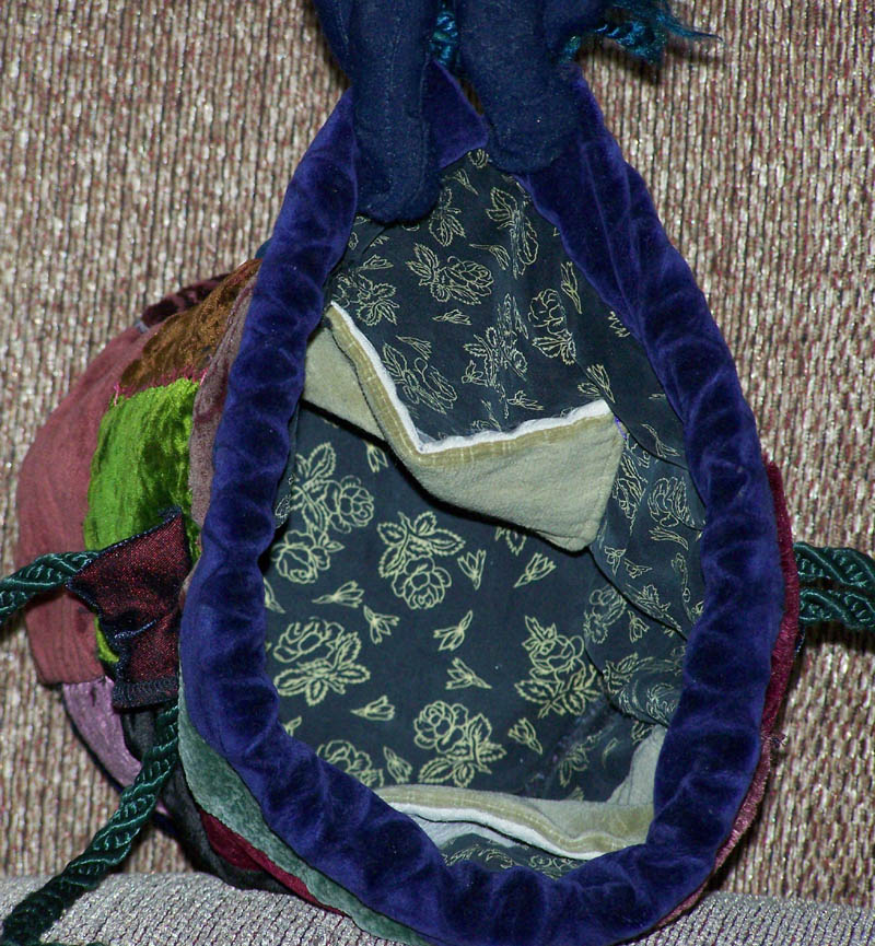 "Roundbottom 1" is a fancy tote bag with a reinforced circular bottom, and fancy tapestry fabrics and deep velvets, with a silk lining with pockets and a drapery cord drawstring.